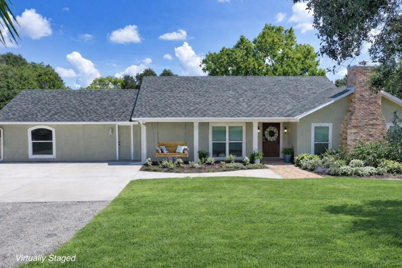 Serene 4-bedroom, 3-bathroom modern farmhouse set on 5 acres with beautiful landscaping and peaceful pond views. Features a brand-new roof, new culvert, impact windows, gutters and water heater. Cozy family room with a charming wood-burning fireplace. Newly renovated kitchen with custom cabinets, quartz countertops, and breakfast nook. Primary suite offers a large shower and walk-in closet. Relax by the pool with farm views or unwind in the Florida room. 2 wells. No HOA, paved road, and conveniently located close to all Vero Beach's amenities.
